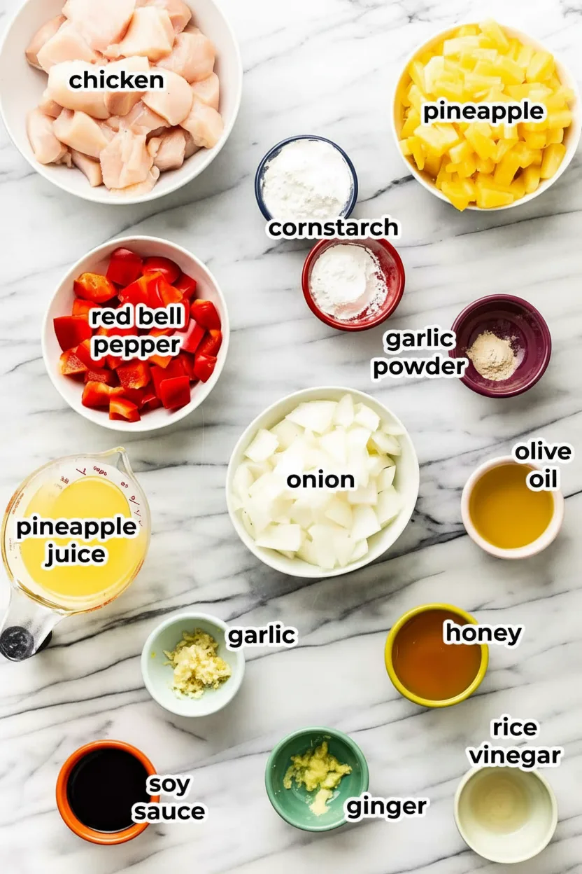 Für unser Ananas Hähnchen benötigst du hauptsächlich frische Zutaten und einige Grundzutaten aus deinem Vorratsschrank. Die meisten Zutaten lassen sich leicht ersetzen oder anpassen, falls du bestimmte Vorlieben hast.