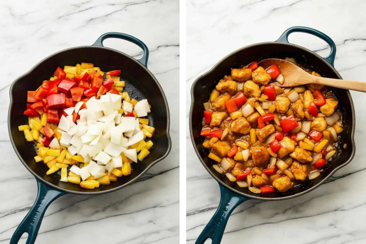 Gib bei Bedarf einen kleinen Schuss Öl in die Pfanne und brate die Ananasstücke 1 Minute an ohne zu rühren. Füge dann Paprika und Zwiebel hinzu und brate alles 3 Minuten weiter, bis das Gemüse bissfest ist. Gib das Hähnchen zurück in die Pfanne. Verrühre in einer separaten Schüssel alle Saucenzutaten gleichmäßig und gieße sie über das Pfannengericht. Lass alles 1-2 Minuten köcheln, bis die Sauce eindickt. Sofort servieren!