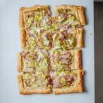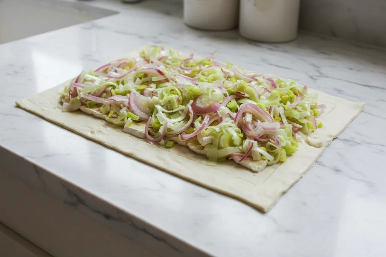 Diese knusprige Blätterteig-Tarte mit Lauch, Zwiebeln und Camembert ist einfach zuzubereiten und schmeckt fantastisch – perfekt für Gäste oder als leichtes Abendessen.