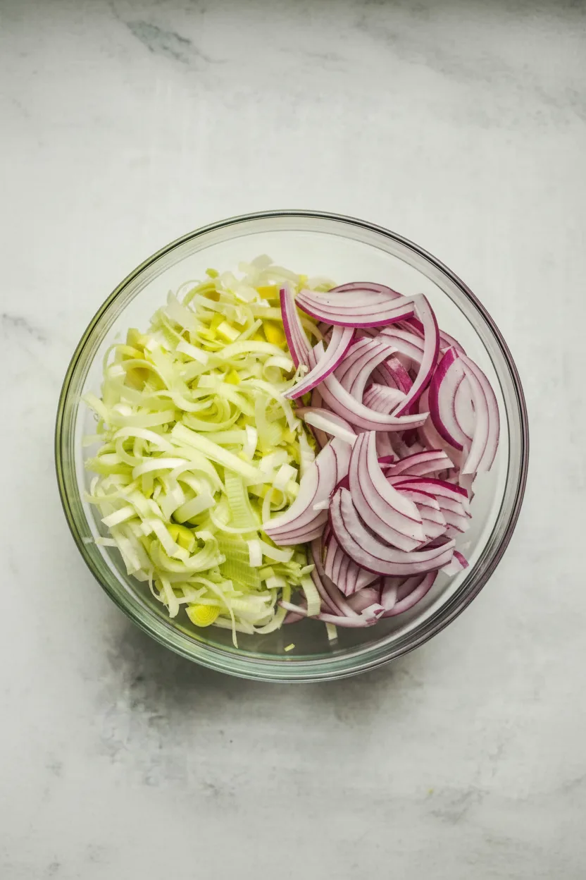 - Zwiebel und Lauch vorbereiten, Knoblauch fein hacken.