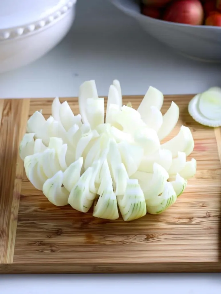 Beginne damit, die Zwiebel zu schälen und den Wurzelansatz flach abzuschneiden. Drehe die Zwiebel nun so, dass die Wurzel nach unten zeigt. Mit einem scharfen Messer viertelstündige Schnitte von oben nach unten machen, dabei etwa 1 cm vor dem Wurzelende stoppen. Wiederhole dies rundum, bis die Zwiebel gleichmäßig in 16-18 Segmente unterteilt ist. Die geschnittene Zwiebel für 10 Minuten in eiskaltem Wasser einlegen – dadurch öffnen sich die Blütenblätter besser.