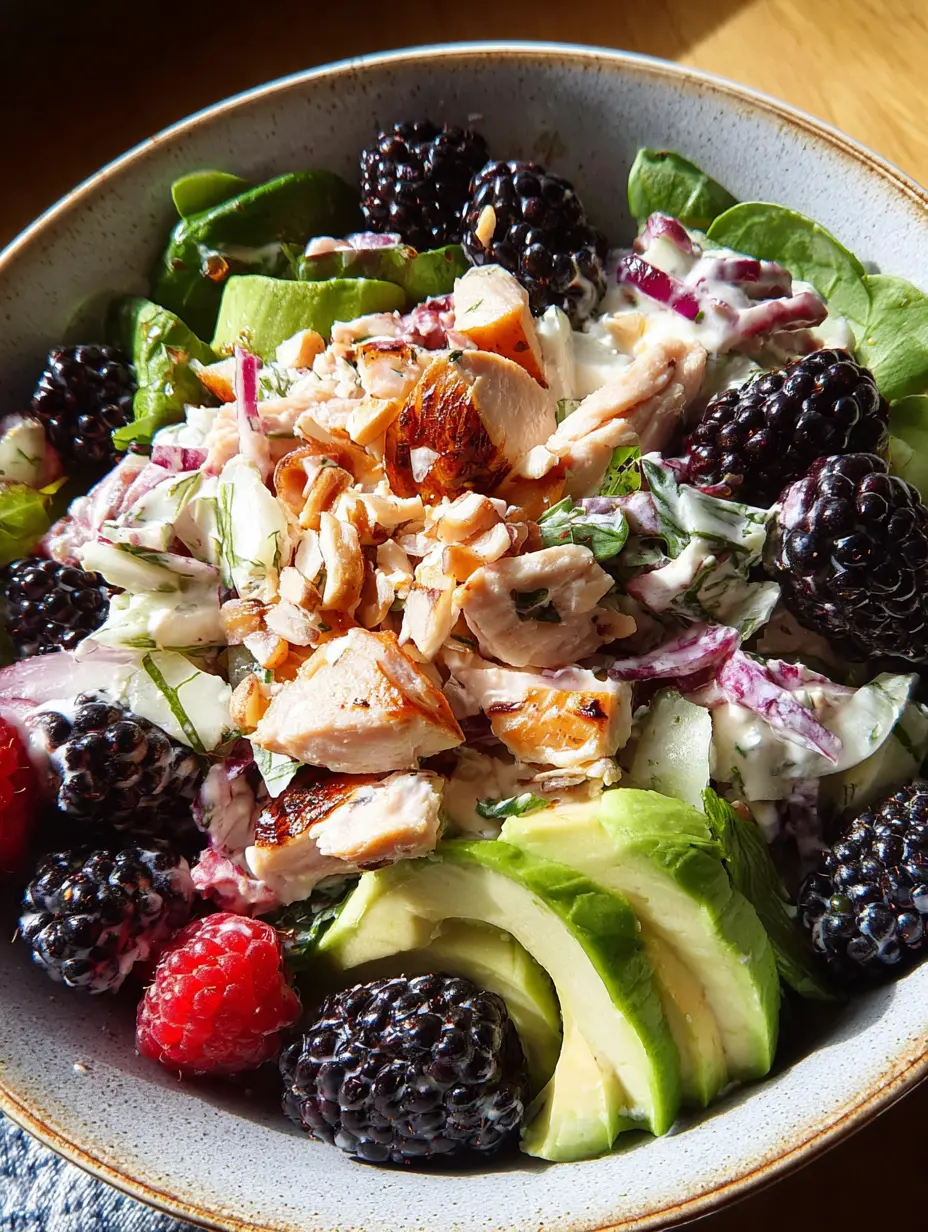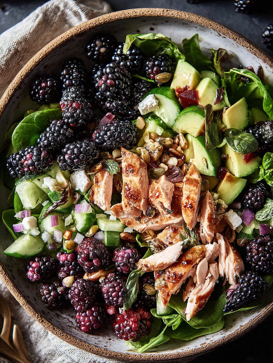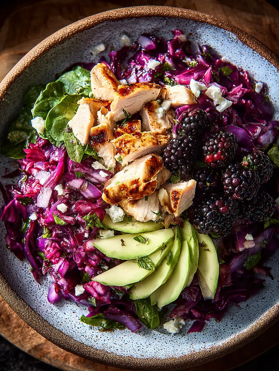 Ein frischer und farbenfroher Salat mit mariniertem Hähnchen, Brombeeren, Avocado und einem fruchtigen Brombeer-Dressing. Perfekt als gesundes Hauptgericht.