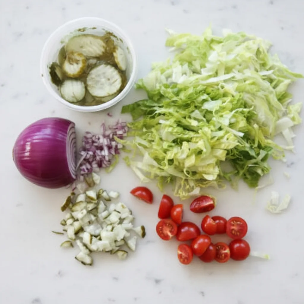 - Wasche und schneide alle Salatzutaten (Salat, Tomate, Zwiebel, Gurken). Bereite die Bacon-Alternative knusprig zu und zerbröselle sie.