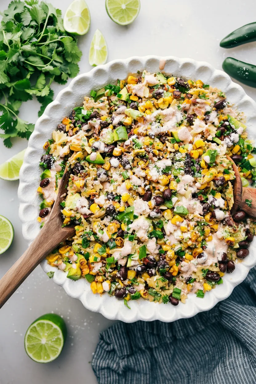 Ein bunter und cremiger Nudelsalat mit dem Geschmack von gebratenem Street Corn, perfekt für Sommer, Grillfeste und Picknicks.