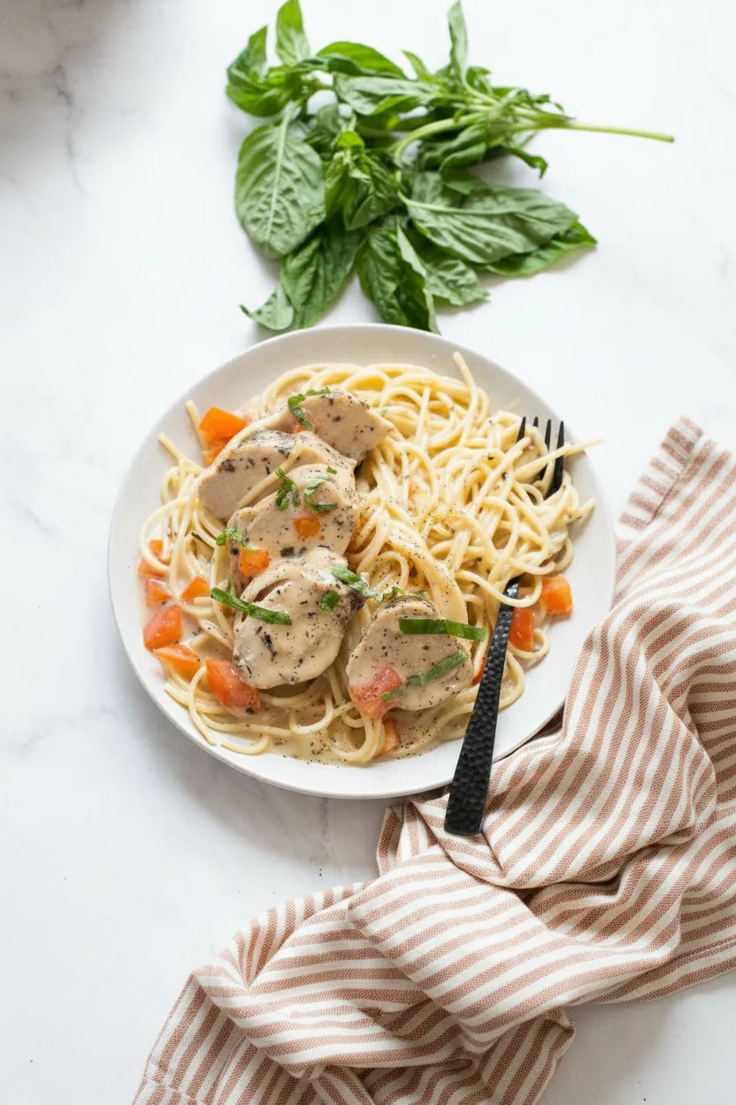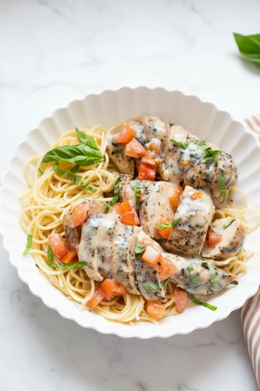 Saftiges Hähnchen in cremiger Käsesauce mit frischen Tomaten und Basilikum – perfektes Komplettgericht aus dem Instant Pot