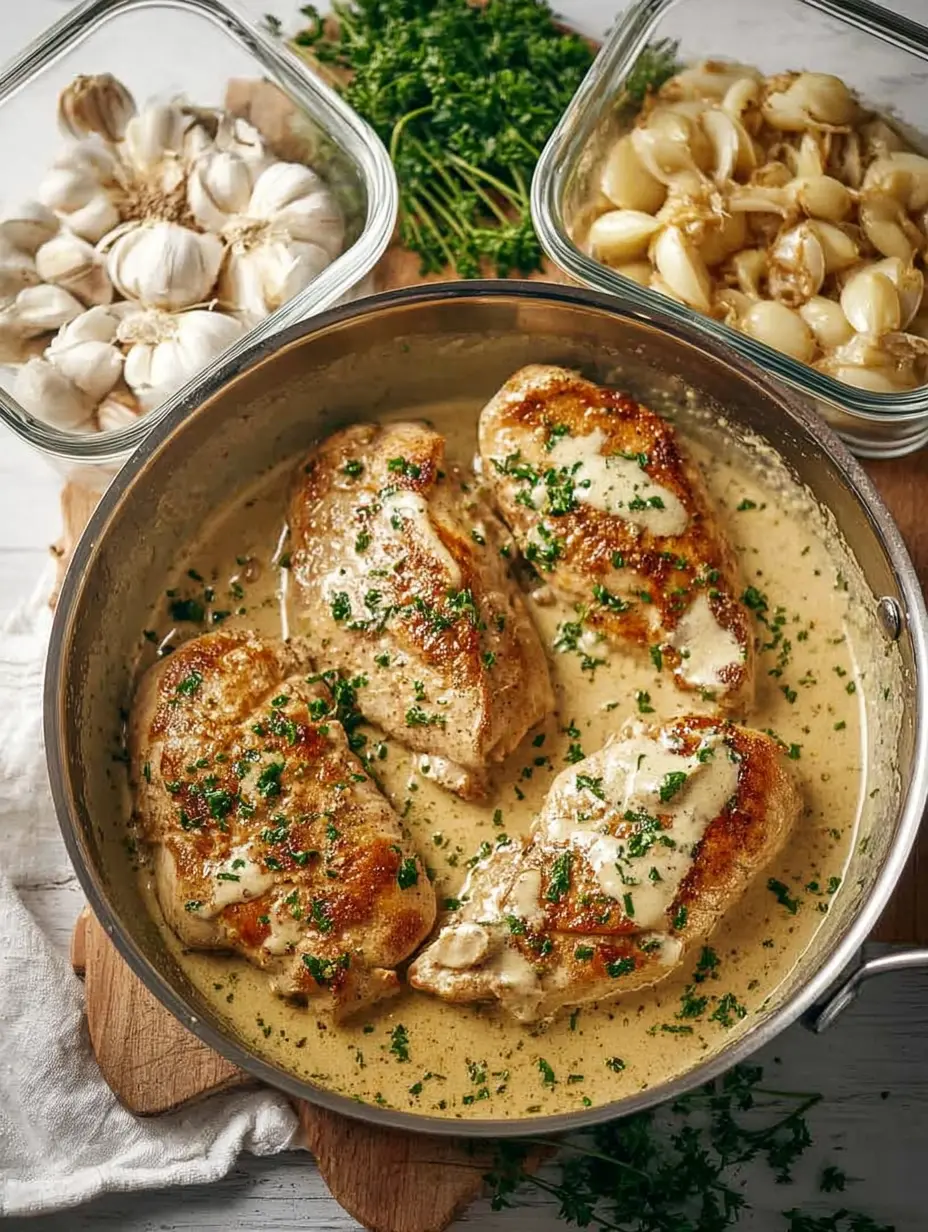 Ein schnelles, cremiges und proteinreiches Hähnchengericht mit intensivem Knoblaucharoma, perfekt für die wöchentliche Essensvorbereitung.
