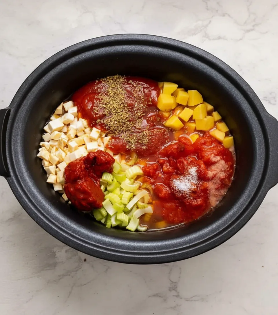 - Karotten, Kartoffeln, Pastinaken, Sellerie, Tomaten, Tomatensoße, Tomatenmark, Würzsauce, Oregano, Paprikapulver, Zucker, 600 ml Brühe und restliches Salz zum Slow Cooker geben.