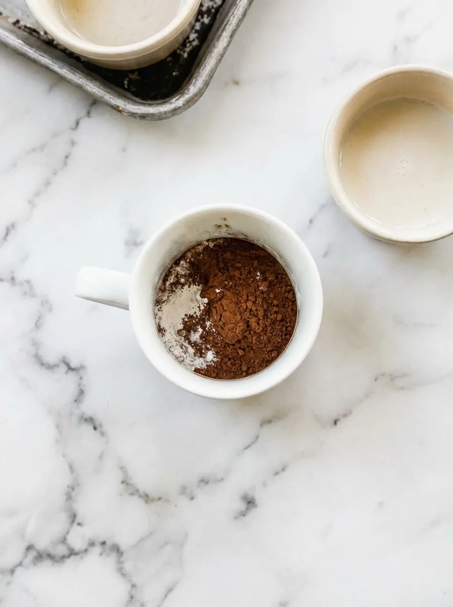 Gib Mehl, Zucker, Kakaopulver, Backpulver und Salz direkt in den Becher. Verrühre alles gründlich mit einem kleinen Schneebesen oder Teelöffel. Achte darauf, dass keine Klumpen entstehen, besonders beim Kakaopulver.