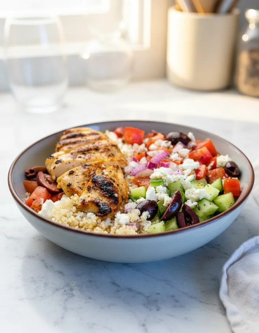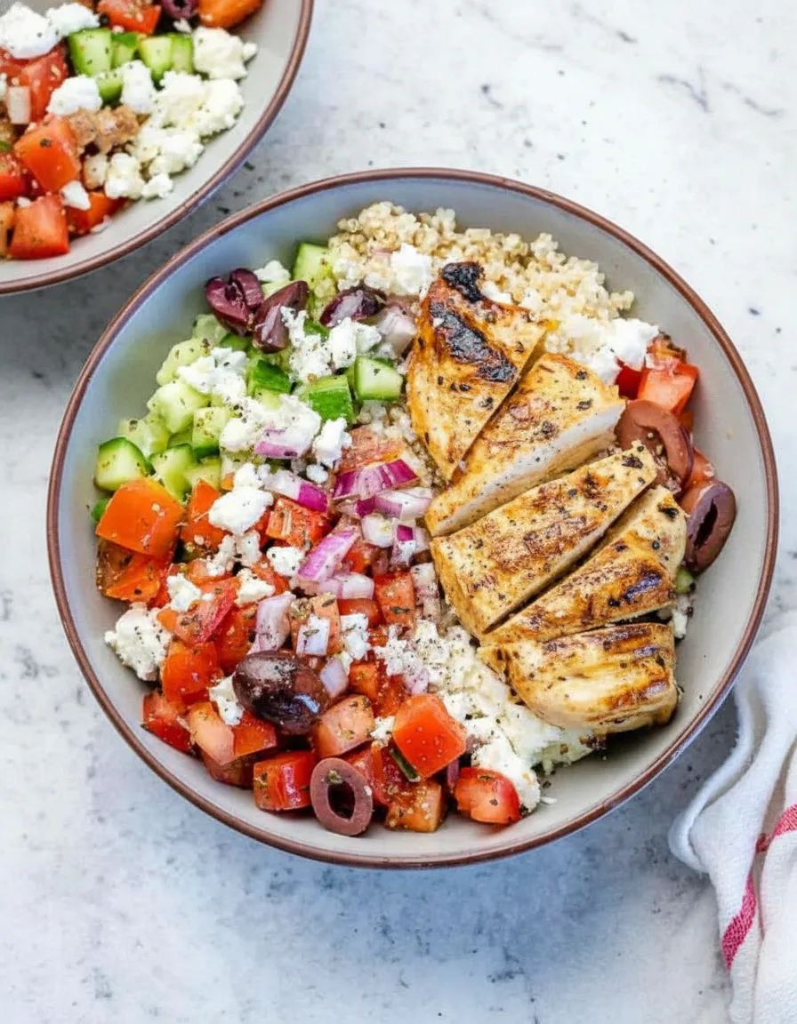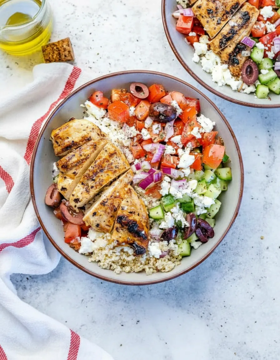Diese griechische Hähnchen-Bowl überzeugt mit ihrer ausgewogenen Kombination aus Proteinen, gesunden Fetten und frischem Gemüse.