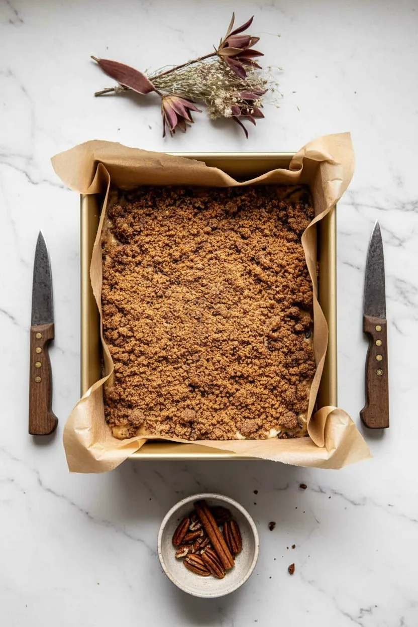 Vermische alle Zutaten für die Streusel in einer kleinen Schüssel. Reibe die Masse mit den Fingern, bis sich schöne Brösel bilden. Gieße die Hälfte des Kuchenteigs in die vorbereitete Form. Verteile die Streusel gleichmäßig darüber. Bedecke die Streusel vorsichtig mit dem restlichen Teig. Es ist in Ordnung, wenn die Streusel an einigen Stellen noch zu sehen sind. Das ergibt ein interessantes Muster.