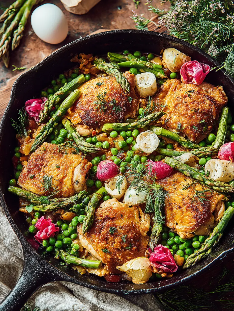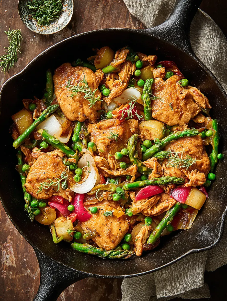 Einfaches Ein-Pfannen-Haehnchen mit knuspriger Haut und frischem Fruehlingsgemuese. Perfekt fuer ein schnelles und gesundes Abendessen.