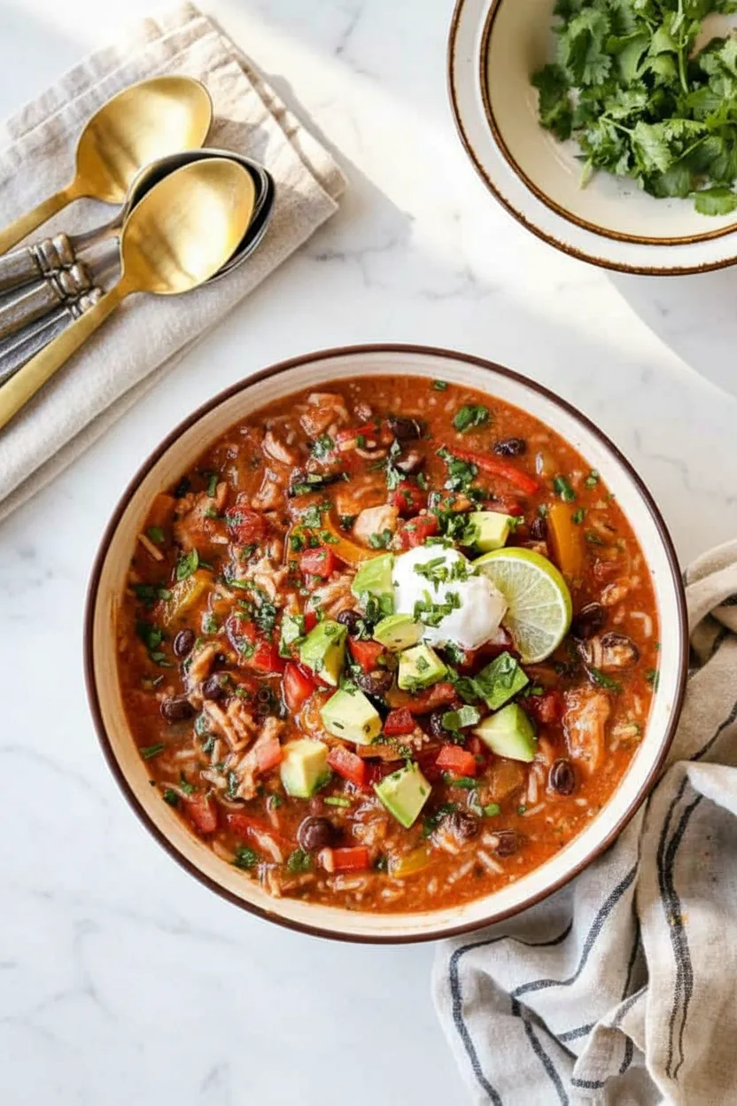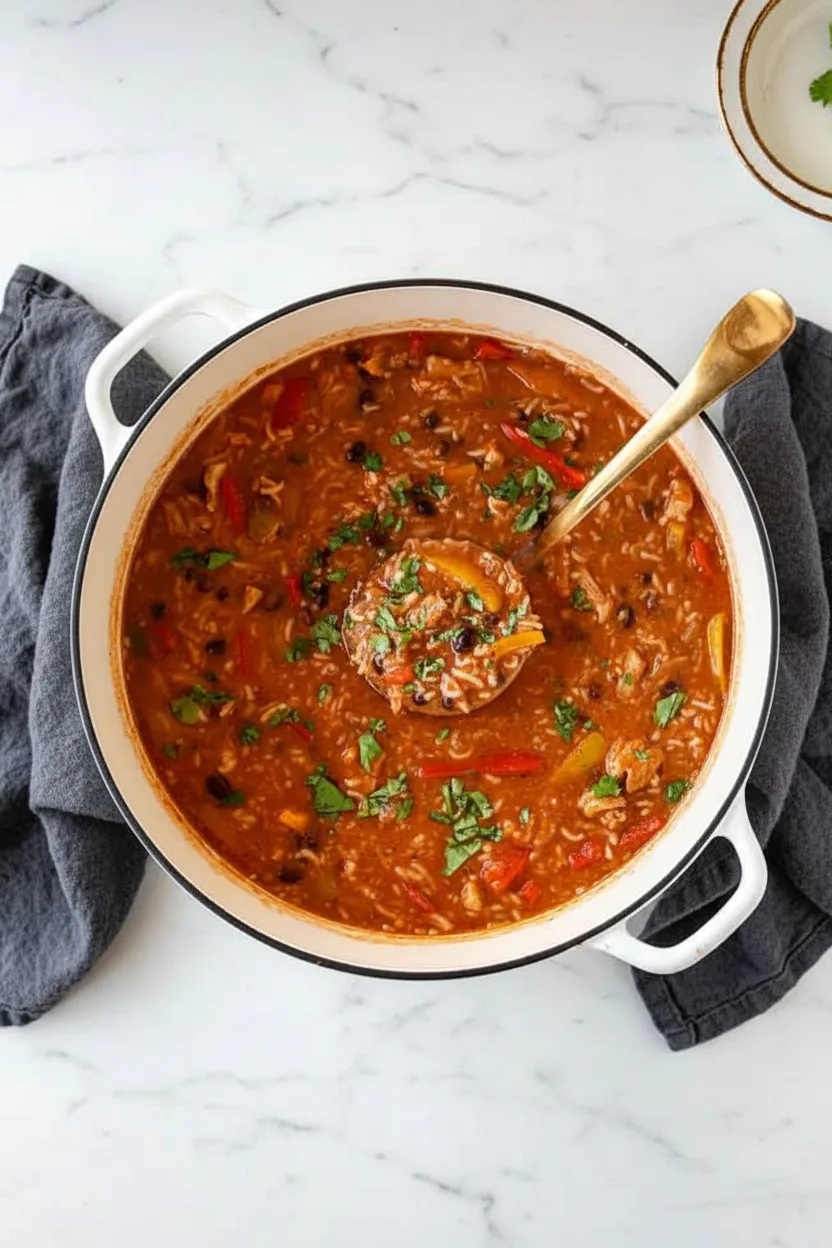 Köstliche mexikanische Reis-Suppe mit Hähnchenstreifen, buntem Paprika-Gemüse und würzigen Fajita-Aromen – alles in einem Topf zubereitet!