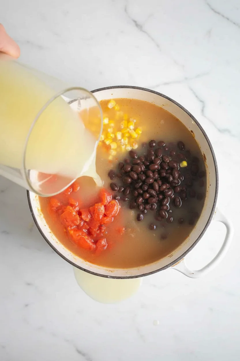 Geben Sie die Tomaten mit ihrem Saft, die abgetropften schwarzen Bohnen, den Mais und die Gemüsebrühe in den Topf. Erhöhen Sie die Hitze und bringen Sie die Suppe kurz zum Kochen. Reduzieren Sie anschließend die Hitze und lassen Sie alles für 10-15 Minuten köcheln.