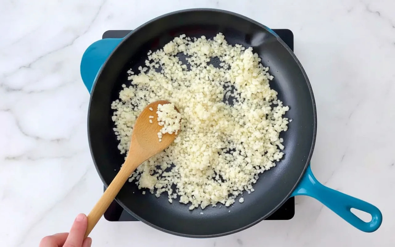 - Eine große Pfanne auf mittlerer Hitze erhitzen und den Blumenkohlreis hineingeben.