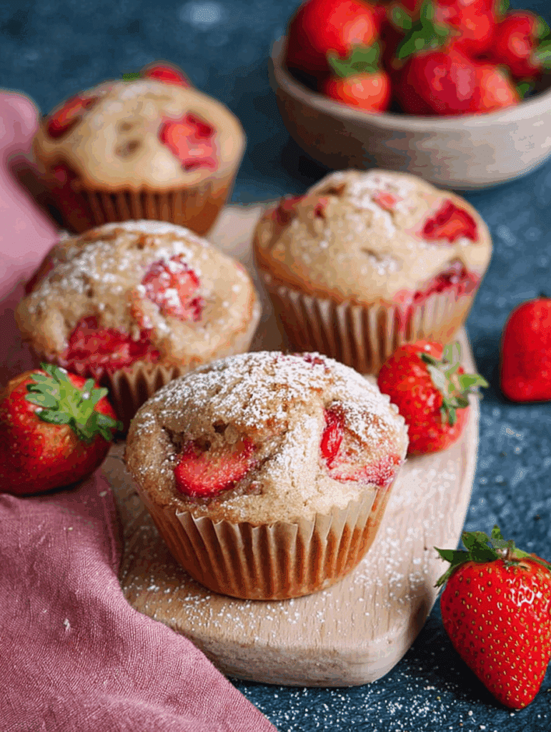 Saftige und fluffige Erdbeer-Muffins, die in nur 45 Minuten fertig sind. Perfekt als Snack, Dessert oder für Gäste – schnell, einfach und unwiderstehlich fruchtig.