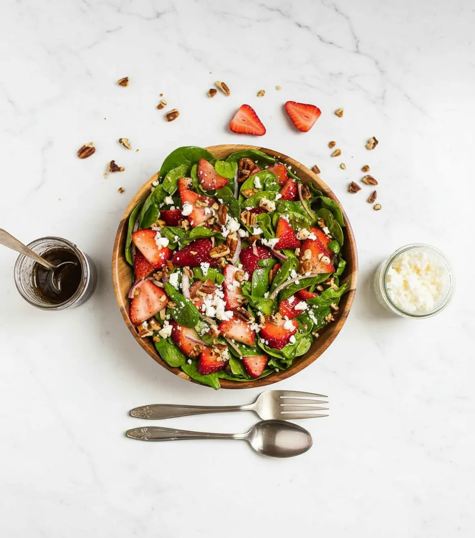 Ein frischer, fruchtiger Salat mit süßen Erdbeeren, zartem Spinat, cremigem Feta und knusprigen Pekannüssen im Honig-Balsamico-Dressing.