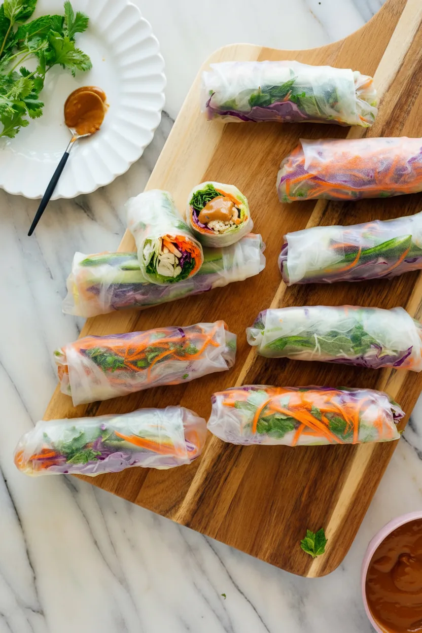 Des Weiteren sind die Rollen sehr vielseitig. Servieren Sie sie als gesunde Vorspeise vor einem üppigeren Hauptgericht. Oder genießen Sie mehrere Stück als vollwertige, leichte Mahlzeit. Sie sind auch ideal für Buffets, Picknicks oder die Lunchbox. Die Erdnusssauce verleiht den frischen Rollen eine herzhafte und nussige Note.