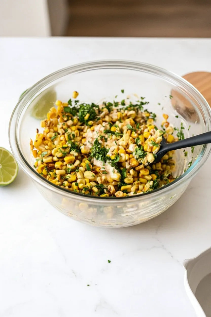 Dieser Schritt ist simpel und bringt den Geschmack. In einer großen Schüssel vermischst du den aufgetauten oder abgetropften Mais mit dem griechischen Joghurt, der Mayonnaise und dem zerbröselten Käse.