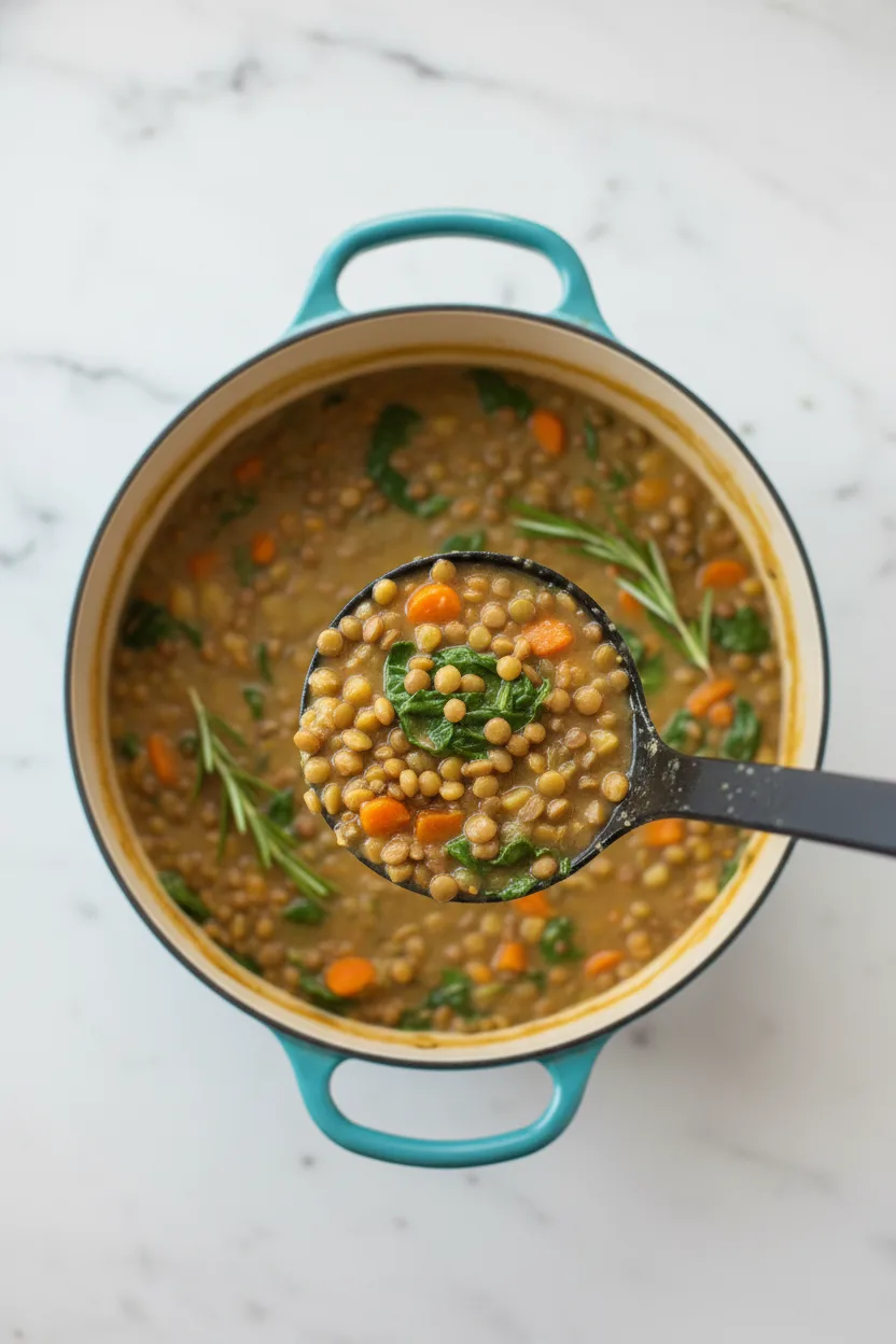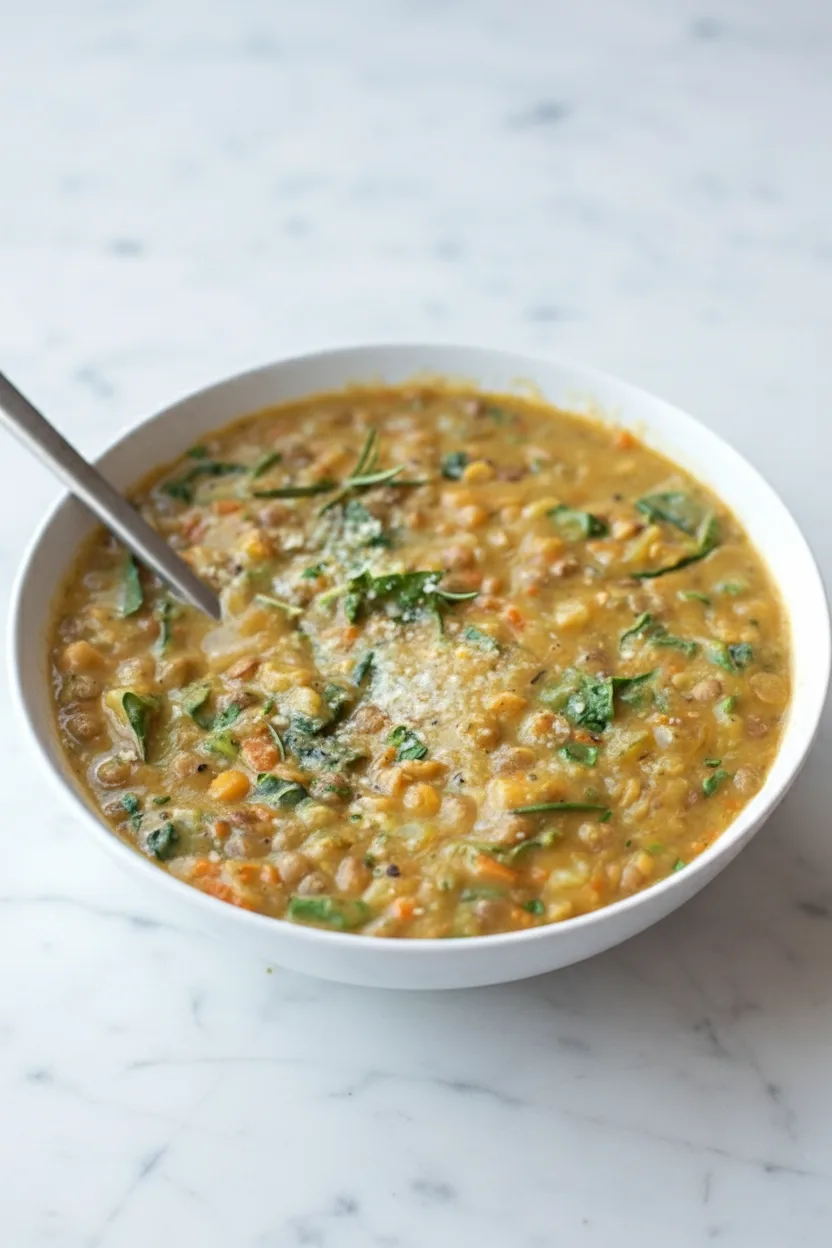 Eine herzhafte, sättigende und cremige Suppe voller Linsen, Erbsen und Gemüse – perfekt als gesundes Hauptgericht.
