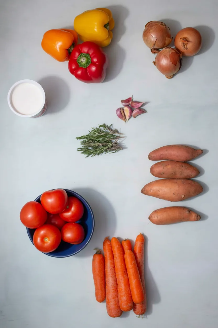 - Bereiten Sie das gesamte Gemüse vor: Zwiebeln und Paprika in Spalten/Scheiben schneiden, Süßkartoffeln und Karotten schälen und in Stücke schneiden, Tomaten vierteln.