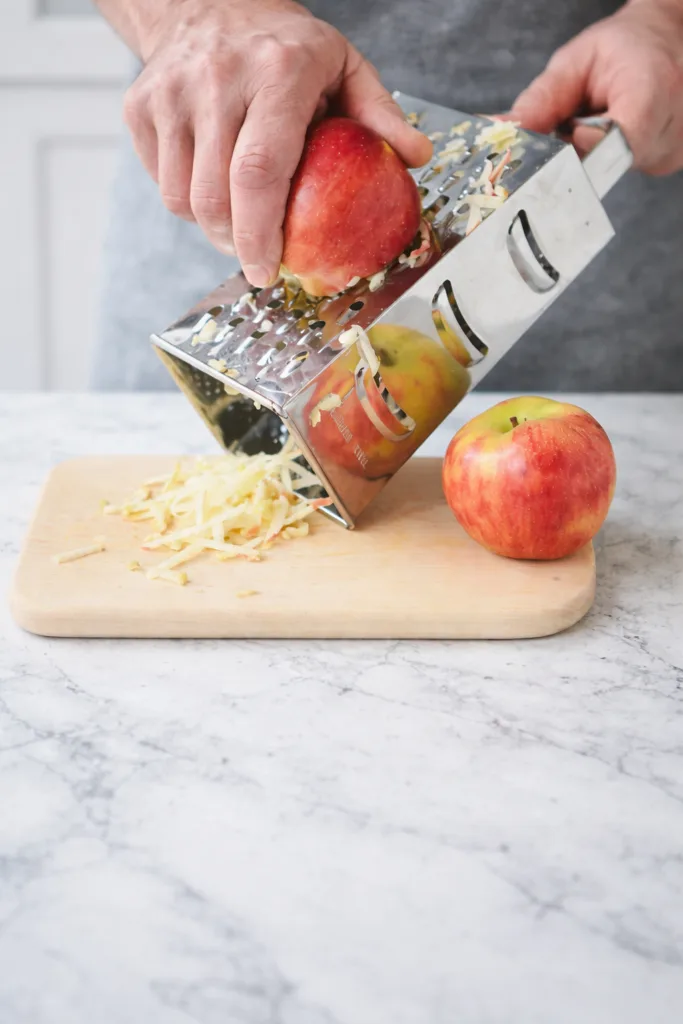 - Zerdrücken Sie die Banane mit einer Gabel und raspeln den Apfel grob. Wichtig: Nur das Fruchtfleisch verwenden, das Kerngehäuse entfernen.
