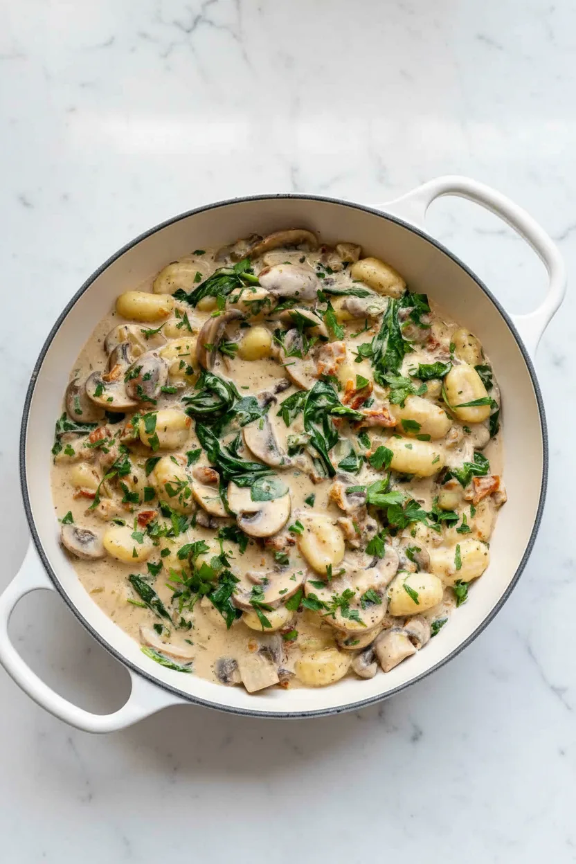 Cremige Gnocchi-Pfanne mit Pilzen und Spinat – perfekt für schnelle Mittagessen