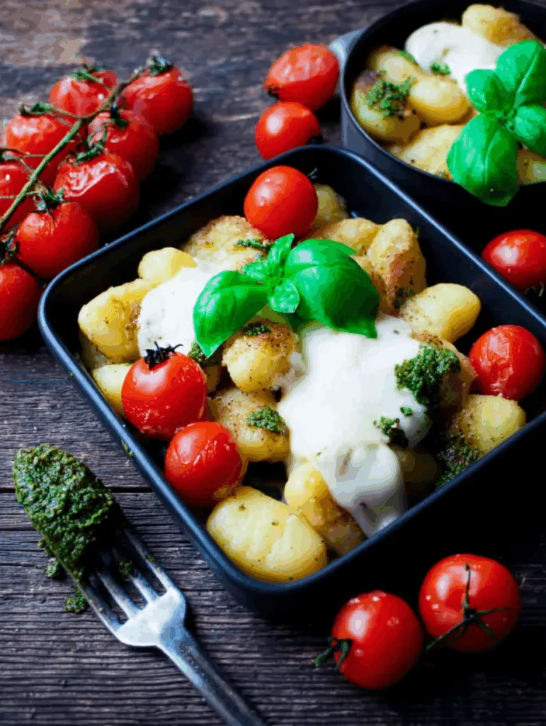 Die frischen Tomaten bringen eine leichte Süße und Farbe ins Pfännchen. Der Mozzarella verleiht dem Gericht die gewünschte Cremigkeit und sorgt für den unverwechselbaren Fädenzieh-Moment. Ein Spritzer Olivenöl rundet alles ab und verleiht den Gnocchi eine goldbraune, appetitliche Kruste.