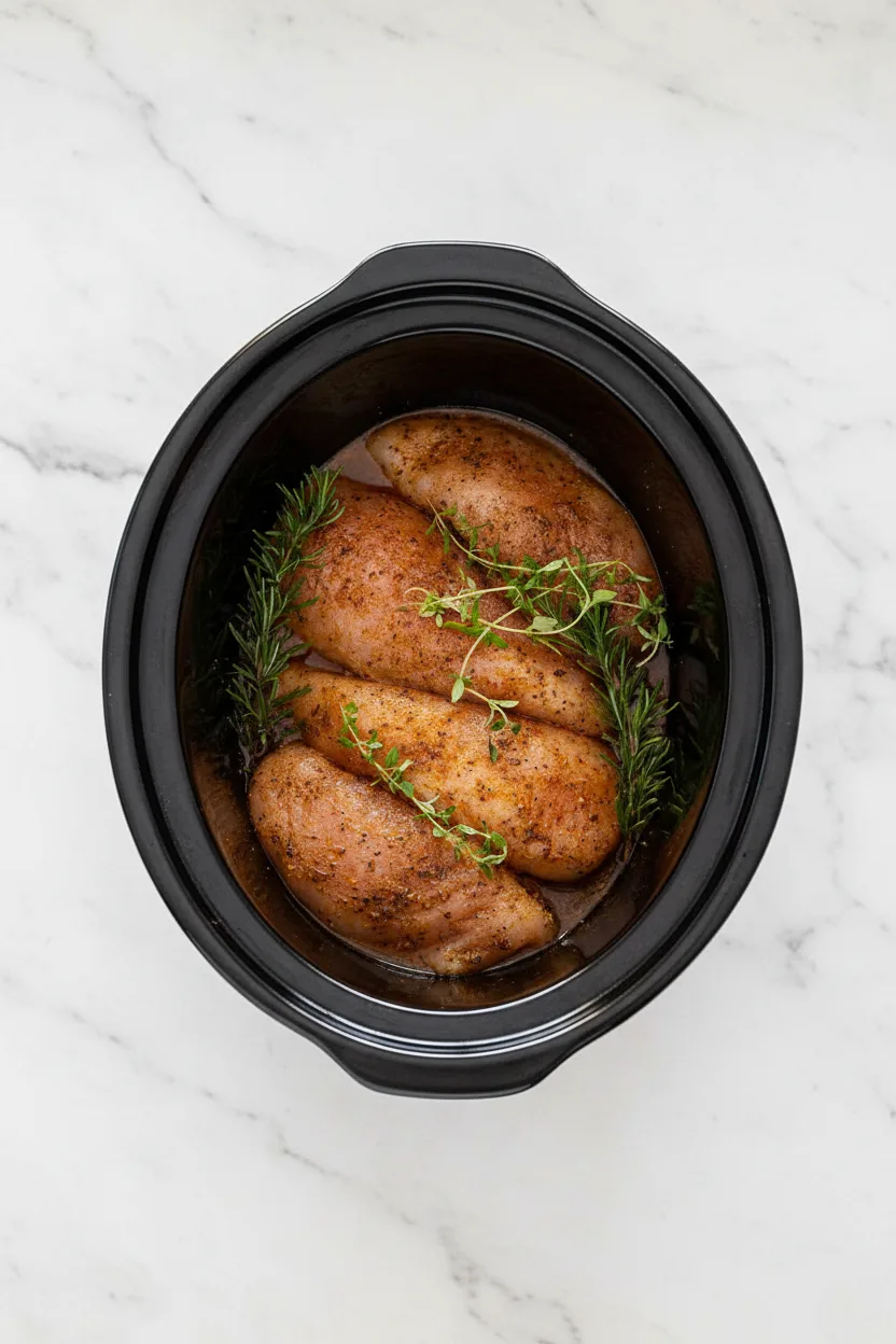 Gieße die Hühnerbrühe in den 6-Liter-Slow Cooker. Lege die gewürzten Filets nebeneinander hinein. Wenn du Thymian und Rosmarin verwendest, verteile die Kräuterzweige gleichmäßig über dem Fleisch.