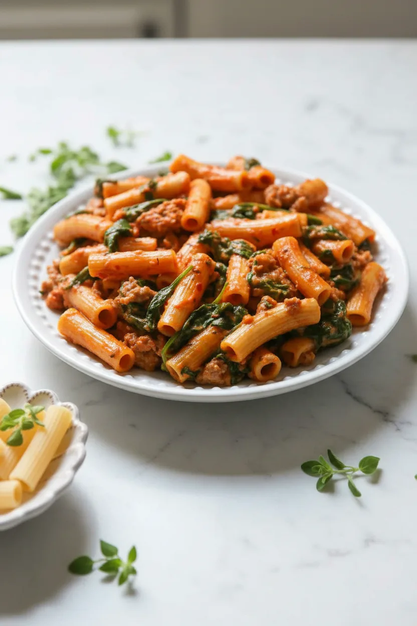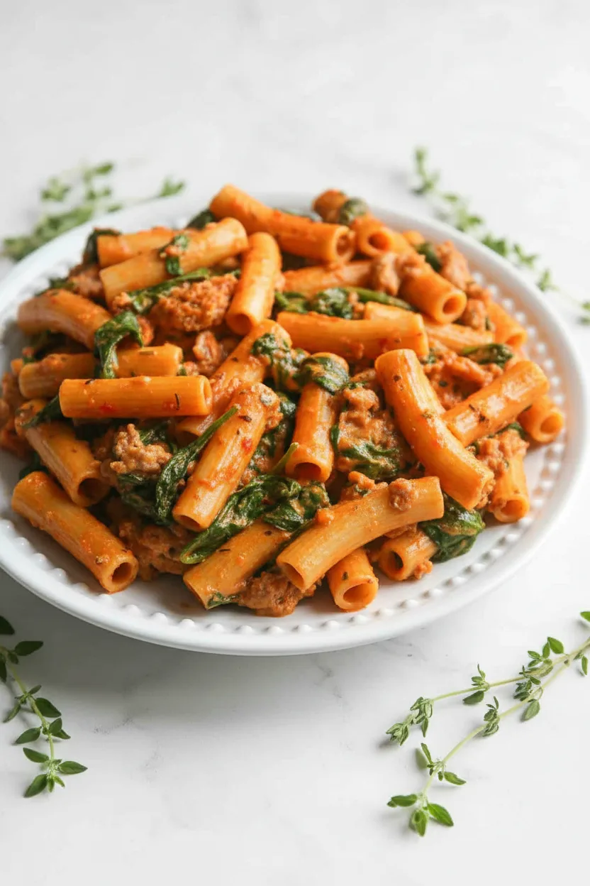 Cremige Rigatoni mit würziger Bratwurst und frischem Spinat – einfaches Ein-Topf-Gericht in 30 Minuten
