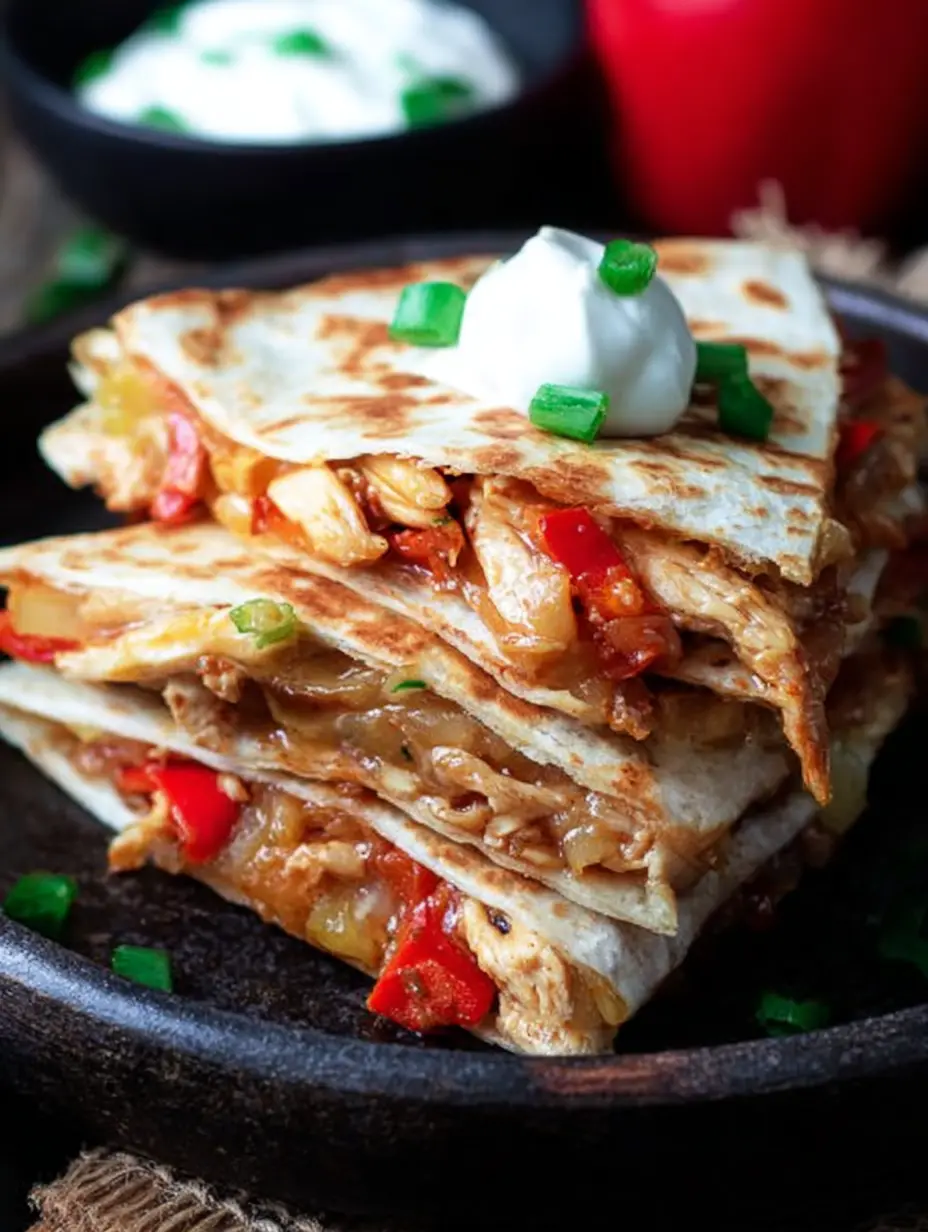 Indem man die Fajita-Füllung – also gewürztes Hähnchen und das klassische Paprika-Zwiebel-Gemüse – in eine käsige Quesadilla packt, erhält man ein handliches, sauberes und unglaublig schmackhaftes Paket. Es ist die ideale Lösung, wenn Sie den Geschmack von Fajitas lieben, aber keine Lust auf das Zusammenbauen einzelner Tortillas am Tisch haben.