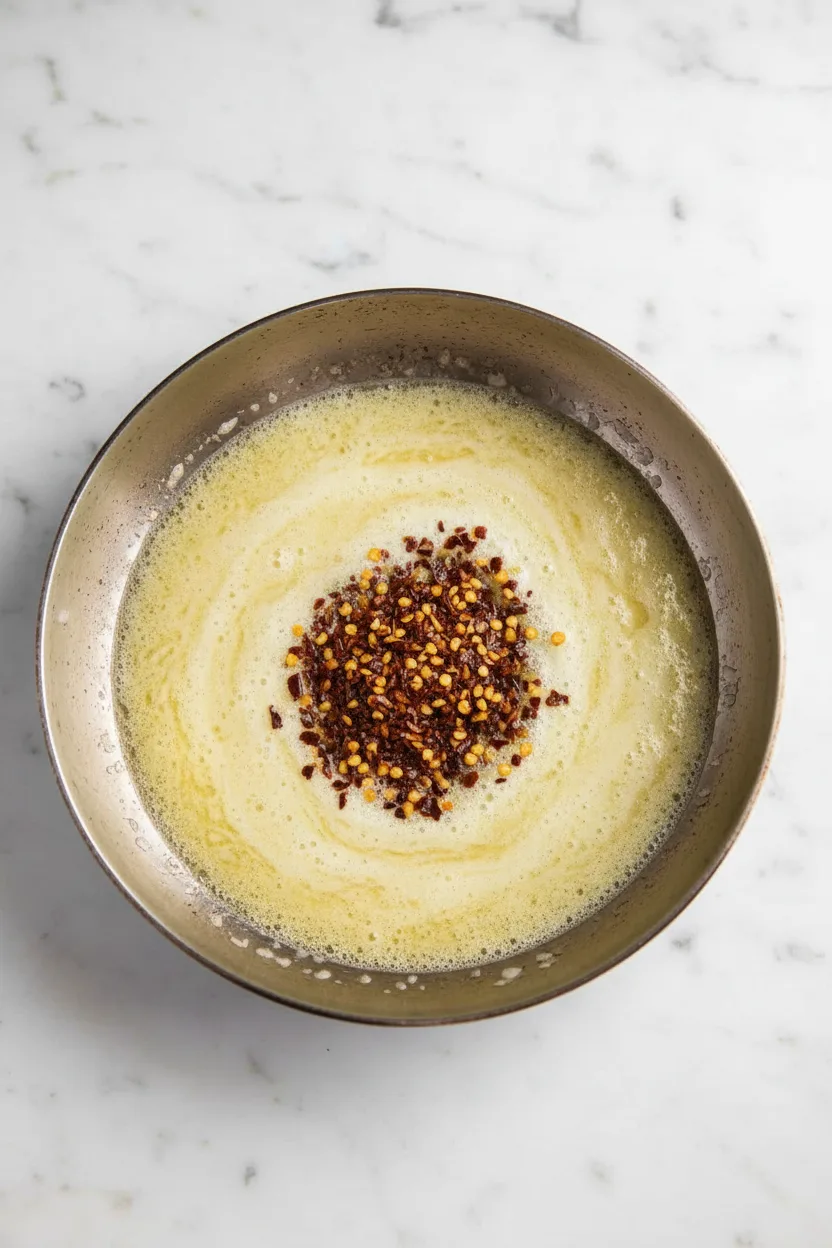 - In einer Pfanne Butter, 1 EL Öl, Chiliflocken und Kreuzkümmel schmelzen. Bei mittlerer Hitze 1-2 Minuten aromatisieren.