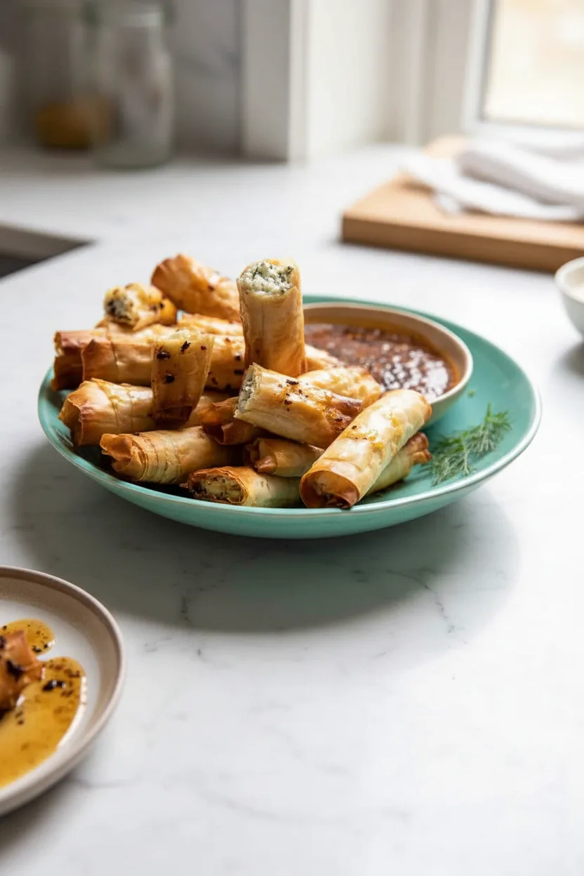Knusprige Feta-Röllchen mit Honig-Chili-Dip – das perfekte Fingerfood für Partys und gemütliche Abende