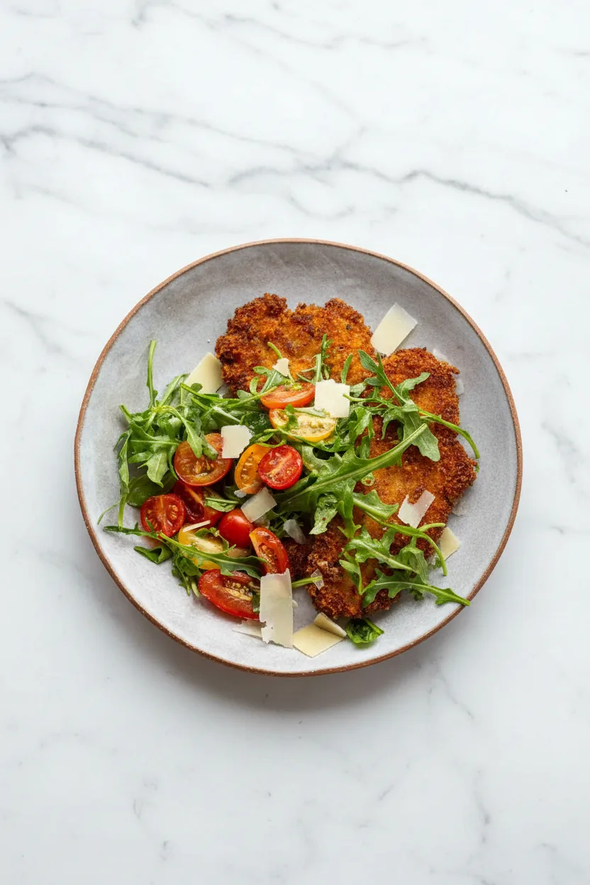 Ein klassisches italienisch inspiriertes Gericht mit knusprig paniertem Hähnchen und frischem Rucola-Tomaten-Salat.