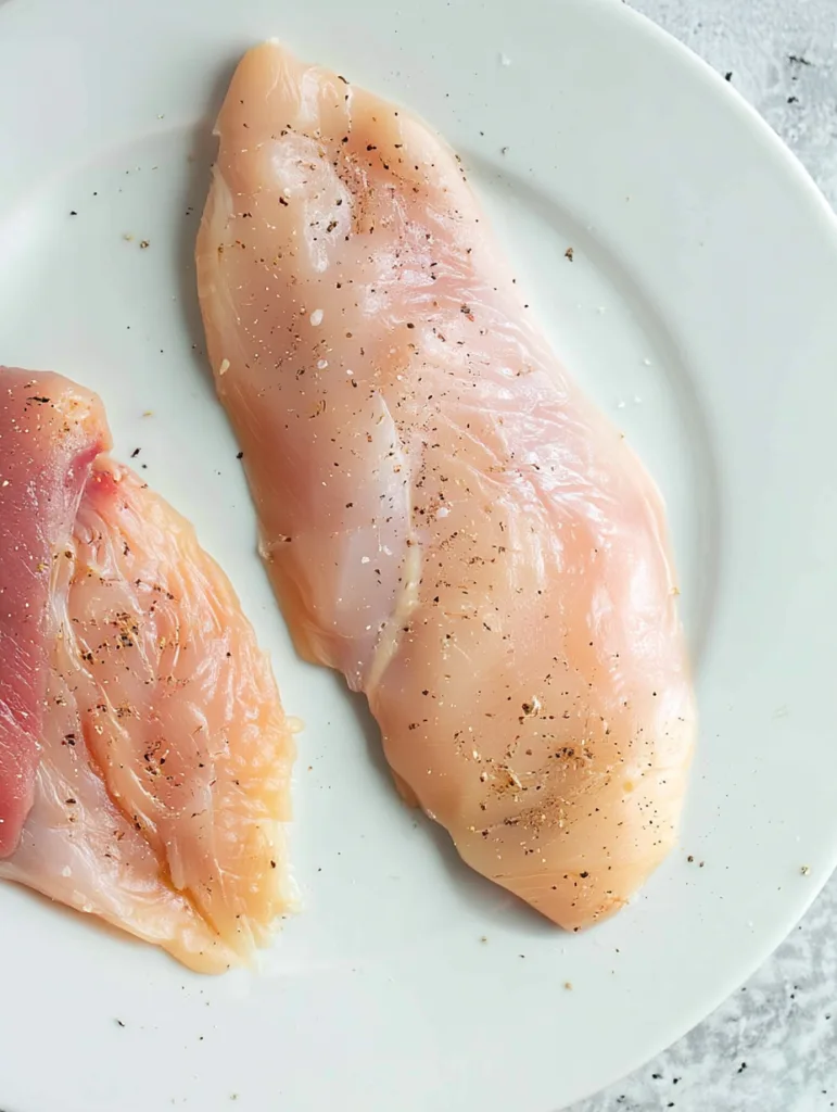 Tupfe das Hähnchenbrustfilet gründlich mit Küchenpapier trocken. Schneide es der Länge nach in zwei flache Schnitzel. Diese dünneren Stücke garen schneller und gleichmäßiger in der Heißluftfritteuse. Würze beide Seiten mit Salz und Pfeffer.