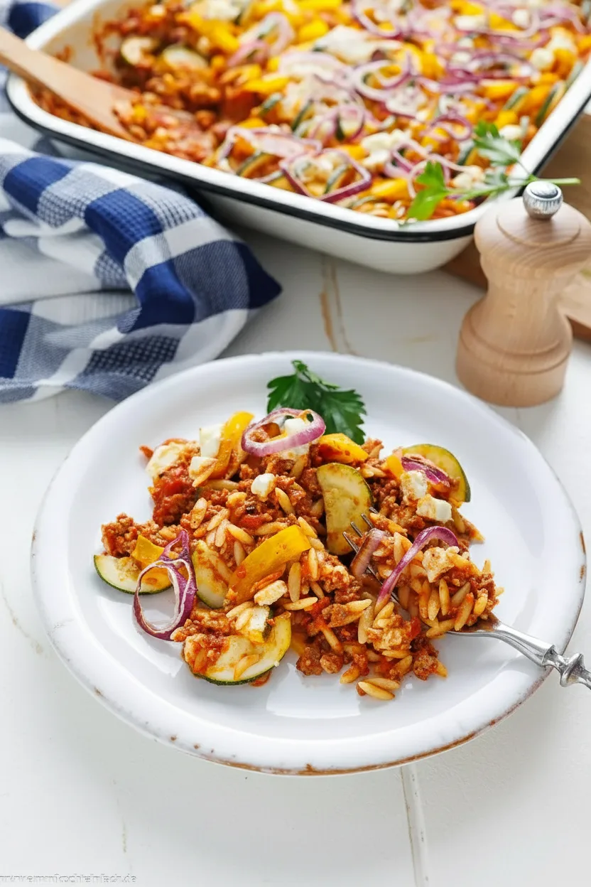 Dieser Kritharaki-Auflauf kombiniert die kräftigen Aromen der mediterranen Küche mit der gemütlichen Wärme eines Ofengerichts.