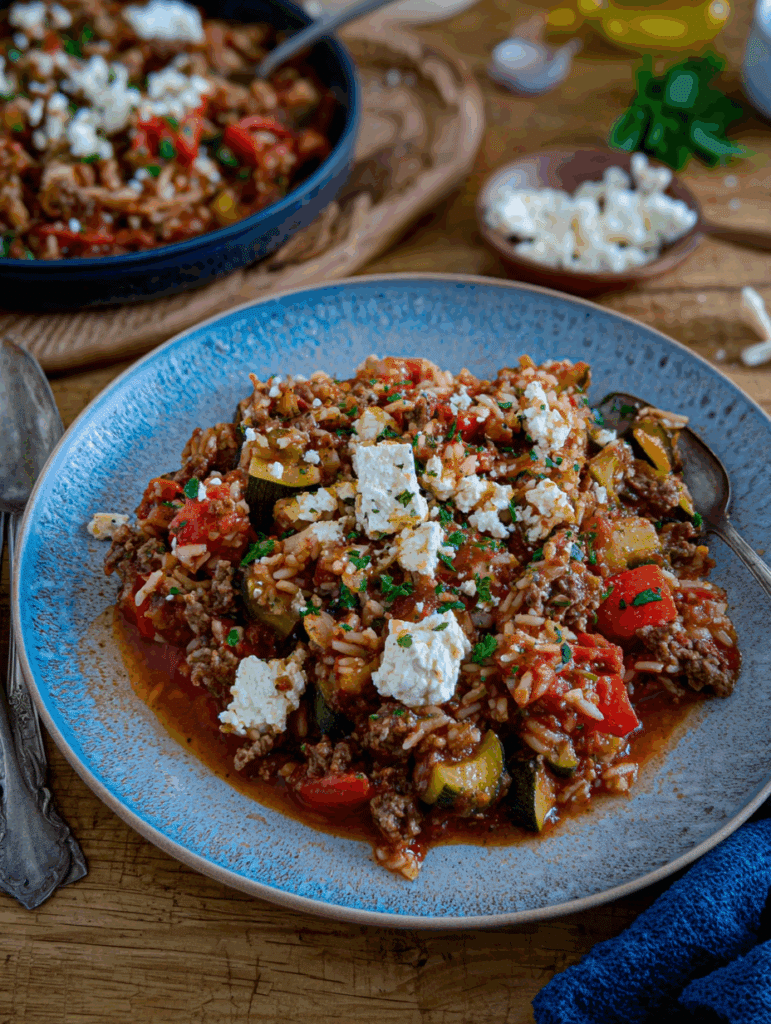 Kritharaki-Hackfleisch-Pfanne mit Gemüse und Feta