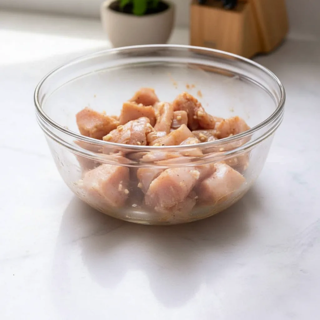 - Die Hähnchenwürfel dazugeben und gut vermengen, bis alles bedeckt ist. Abgedeckt im Kühlschrank mindestens 30 Minuten, bis zu 8 Stunden marinieren lassen.
