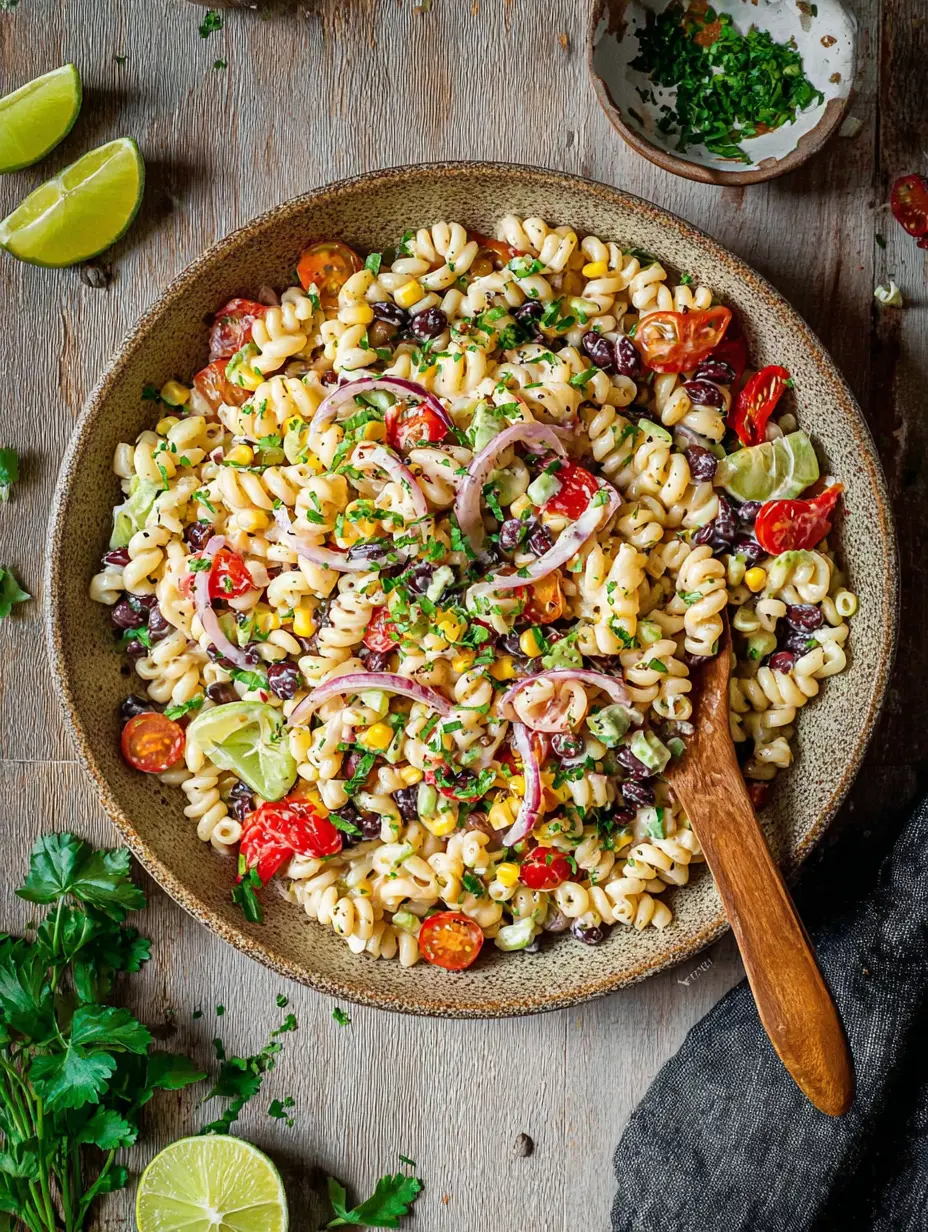 Ein erfrischender, herzhafter Pasta-Salat mit mexikanischen Aromen aus Mais, schwarzen Bohnen, Paprika und einer cremigen Joghurt-Limetten-Dressing-Variante. Perfekt als leichtes, sättigendes Hauptgericht.