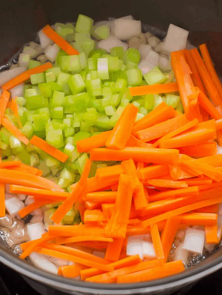 • In einem großen Topf Butter erhitzen und Zwiebeln, Sellerie und Karotten anschwitzen. Das Gemüse wird weich und entwickelt dabei ein süßliches Aroma.