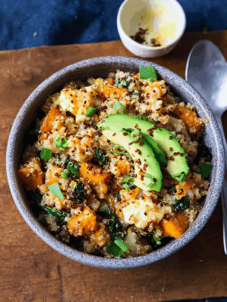 Quinoa ist außerdem glutenfrei und besonders leicht bekömmlich. In Kombination mit Gemüse wie Süßkartoffel und Spinat wird daraus eine ausgewogene Mahlzeit mit Vitaminen, Antioxidantien und langkettigen Kohlenhydraten.