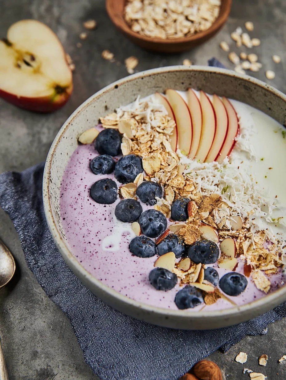 Ein perfekter Start in den Tag gelingt mit dieser cremigen Frühstücksbowl. Sie kombiniert griechischen Joghurt, Haferflocken und frisches Obst zu einem idealen Proteinfrühstück.