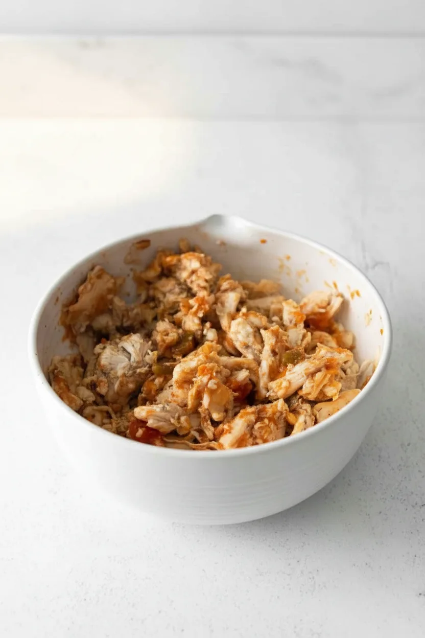 2. Vermenge das pflanzliche Hähnchenersatzprodukt mit der Salsa.