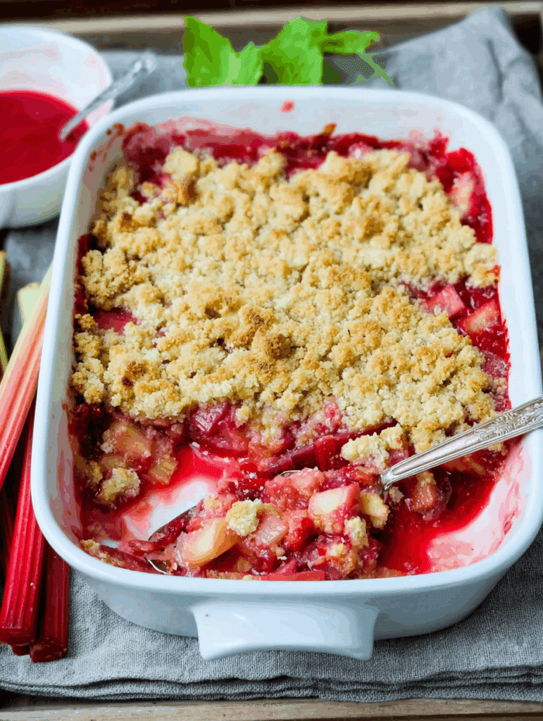Ein einfaches, schnelles Rhabarber-Crumble Rezept mit knusprigen Streuseln und fruchtiger Füllung – perfekt für Frühling und Sommer.