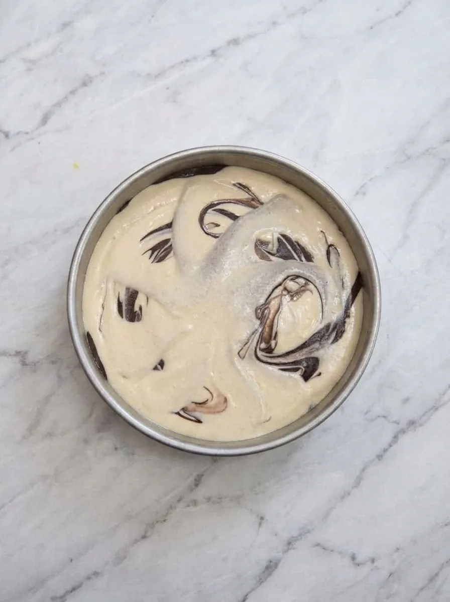 6. Abwechselnd hellen und dunklen Teig in die Form schichten.
