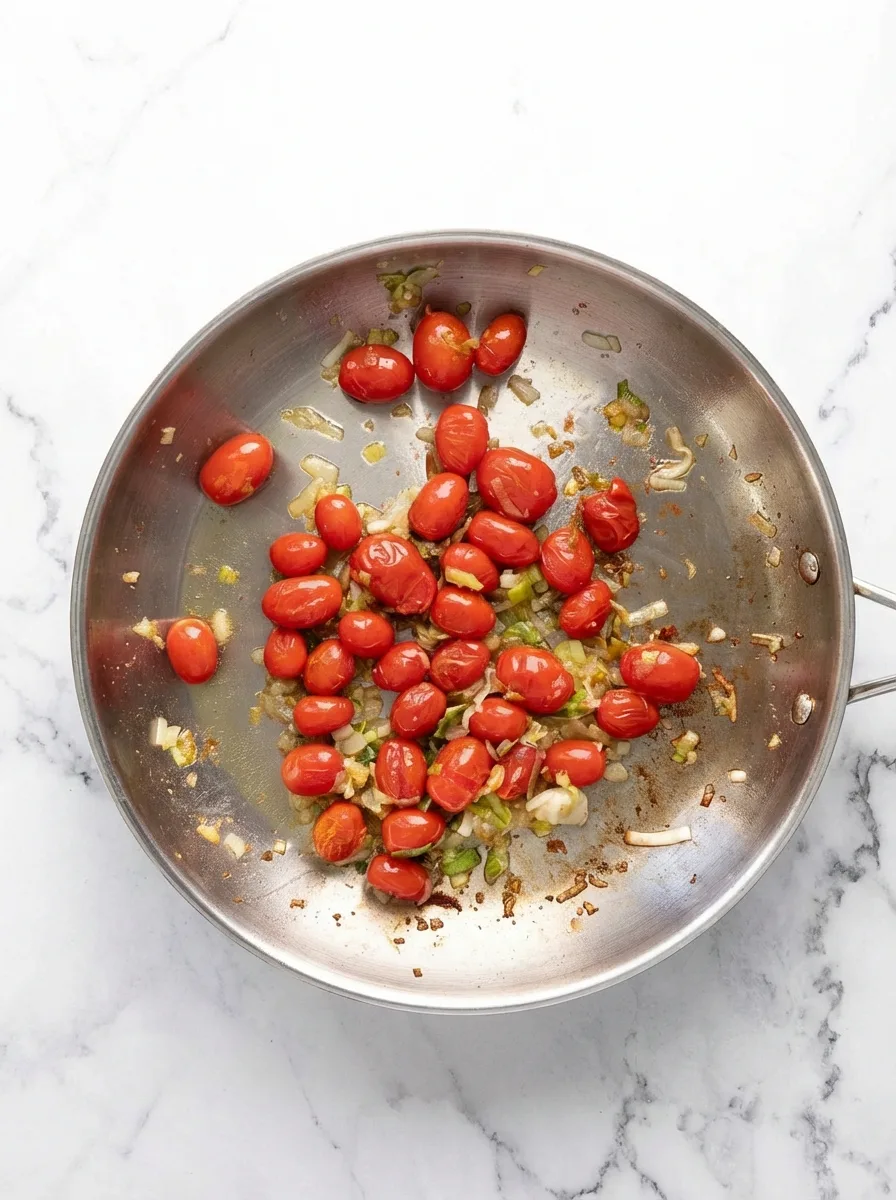 - Tomaten in die Pfanne geben und etwa 5 Minuten kochen, bis die Schale leicht aufplatzt. Mit der Rückseite eines Kochlöffels leicht zerdrücken, damit der Saft austritt und 1-2 Minuten köcheln lassen.