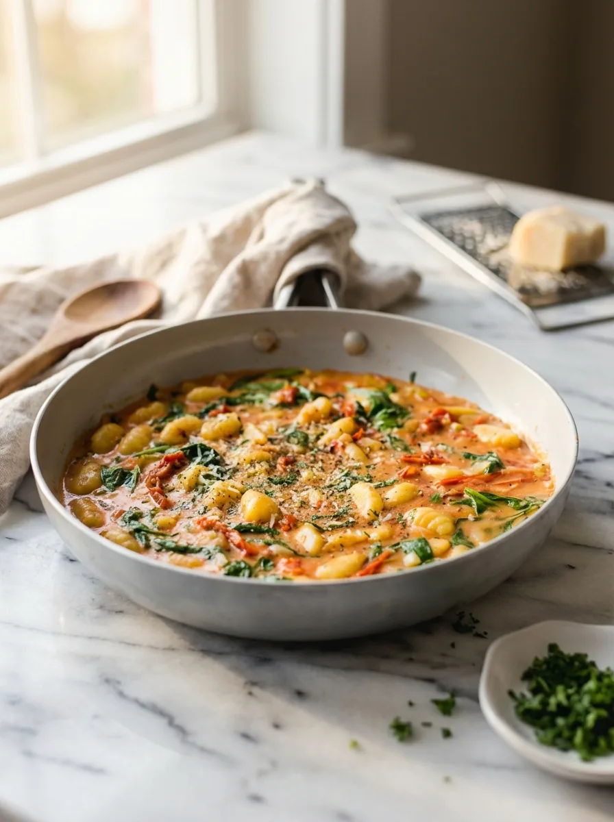Fluffige Gnocchi mit frischen Tomaten, cremiger Sauce und Spinat – perfekt für schnelle Wochenabende in nur einer Pfanne!