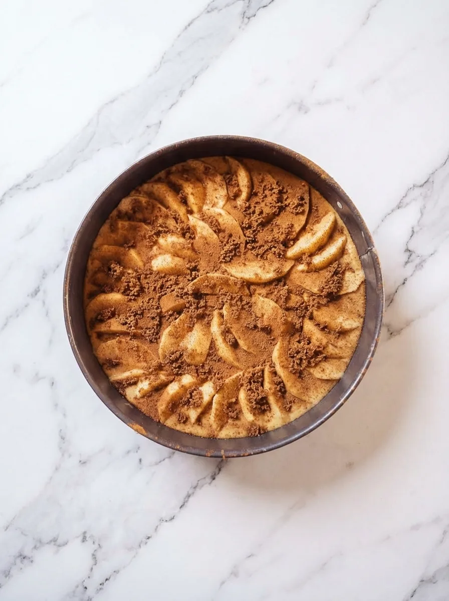 Fülle die Teigmasse in die Springform und verteile sie gleichmäßig. Stecke die Apfelspalten spiralförmig in den Teig – sie sinken später beim Backen leicht ein. Streue braunen Zucker und Zimt gleichmäßig über den Kuchen. Backzeit beträgt etwa 45 Minuten, bis die Stäbchenprobe sauber aus der Mitte kommt.