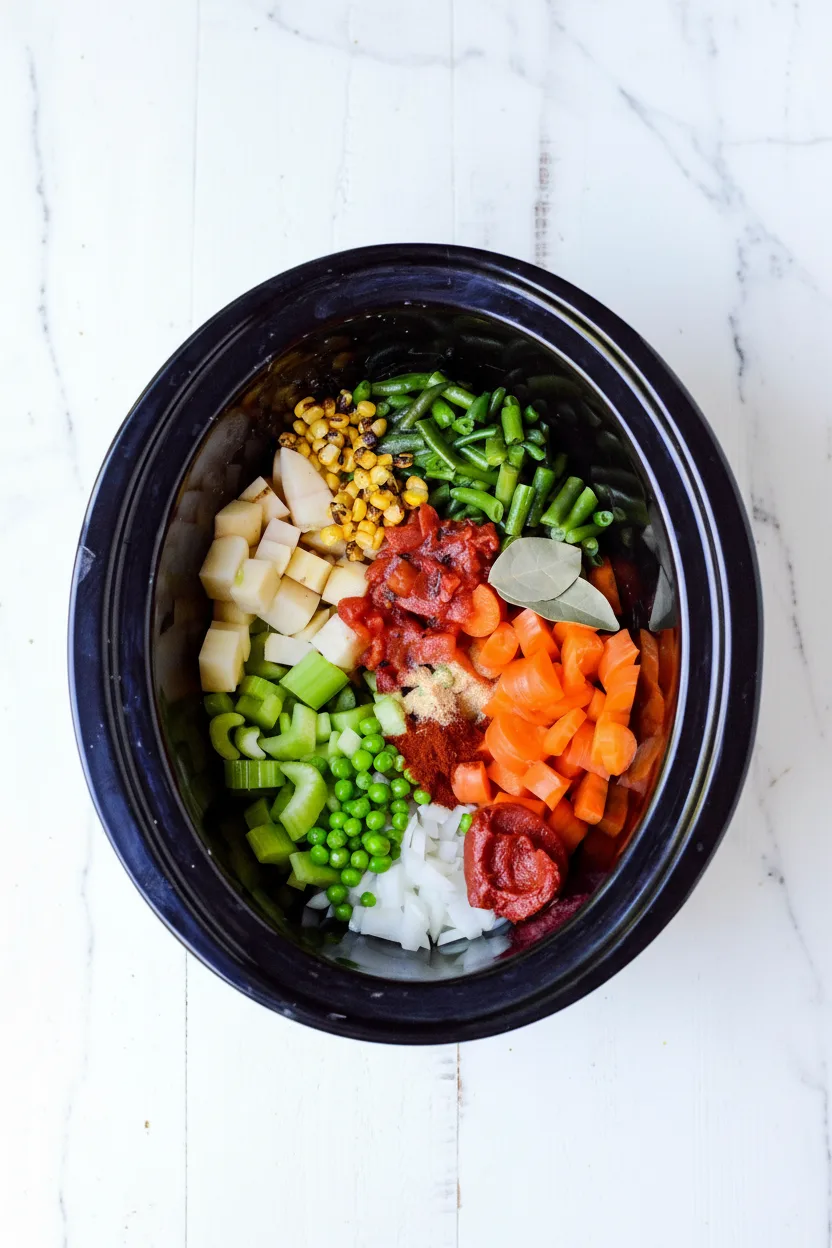Nimm deinen Slow Cooker zur Hand. Gib das gehackte Gemüse – Zwiebel, Karotten, Sellerie, Kartoffeln und Bohnen – hinein. Öffne die Dose mit den gerösteten Tomaten und schütte sie samt Saft dazu.