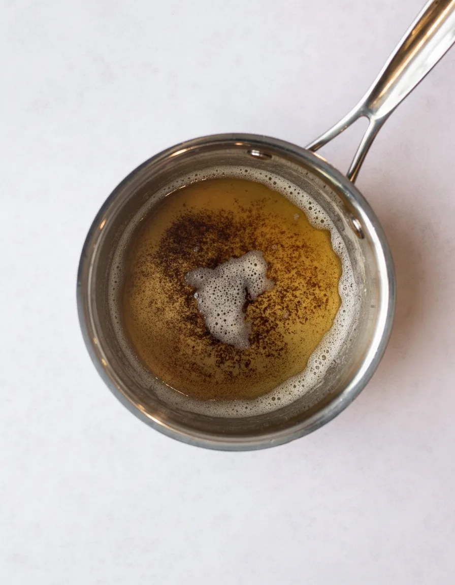 - In einem kleinen Topf Margarine schmelzen, braunen Zucker, Speisestärke, Zimt und Muskat einrühren.