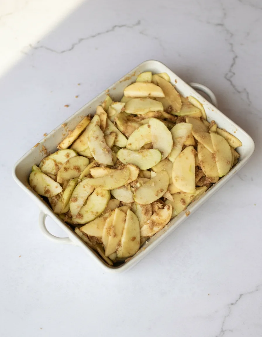 - Zucker-Margarine-Mischung über die Äpfel gießen und gut vermengen. In die vorbereitete Form füllen.